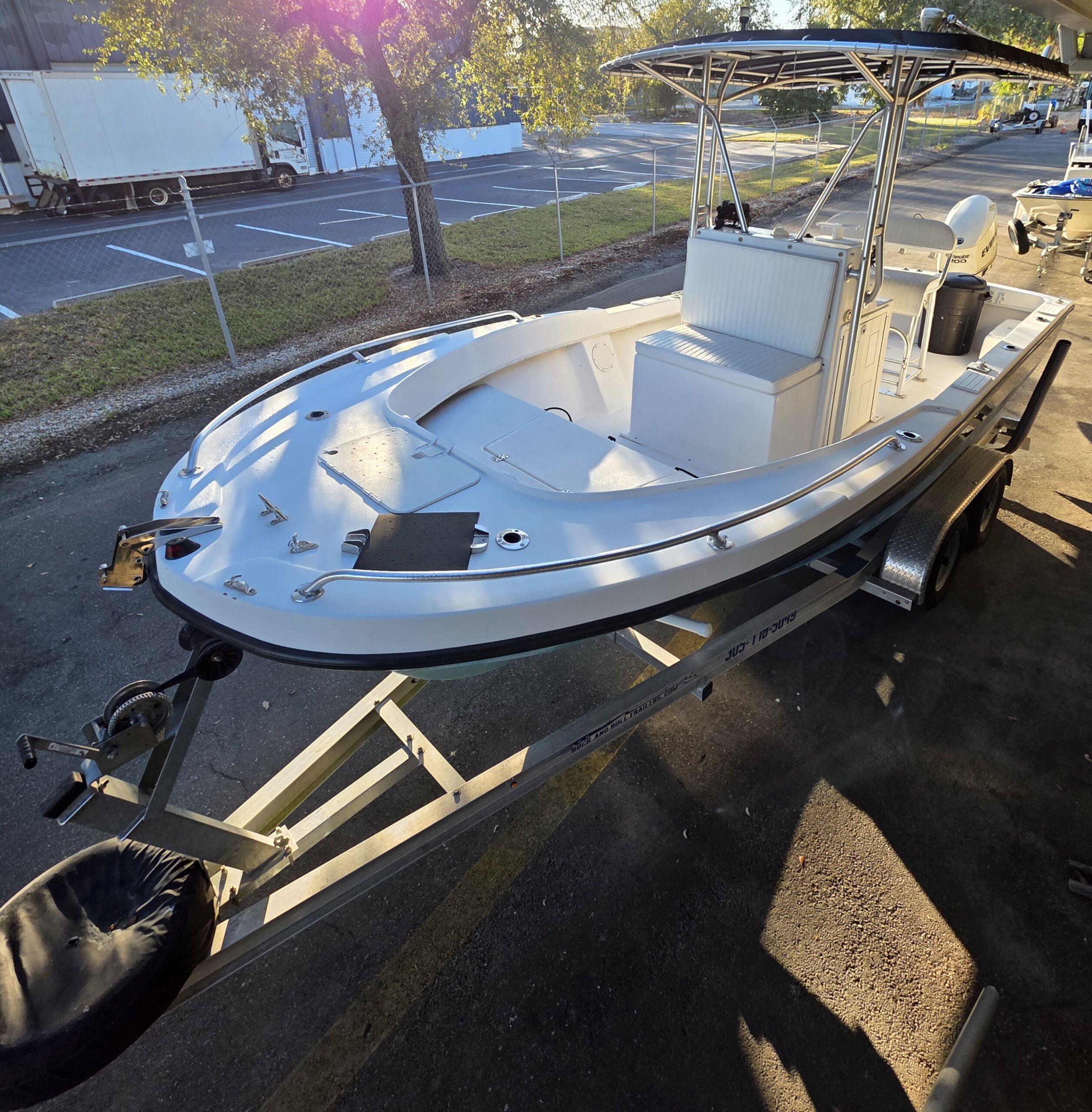 For sale is a 2005 Dusky 203 Center Console powered by a 2008 Evinrude E-TEC 200HP outboard with a 25-inch shaft, sitting on a 2020 Rock & Roll trailer. This 20-foot boat is in great condition and ready for the water.